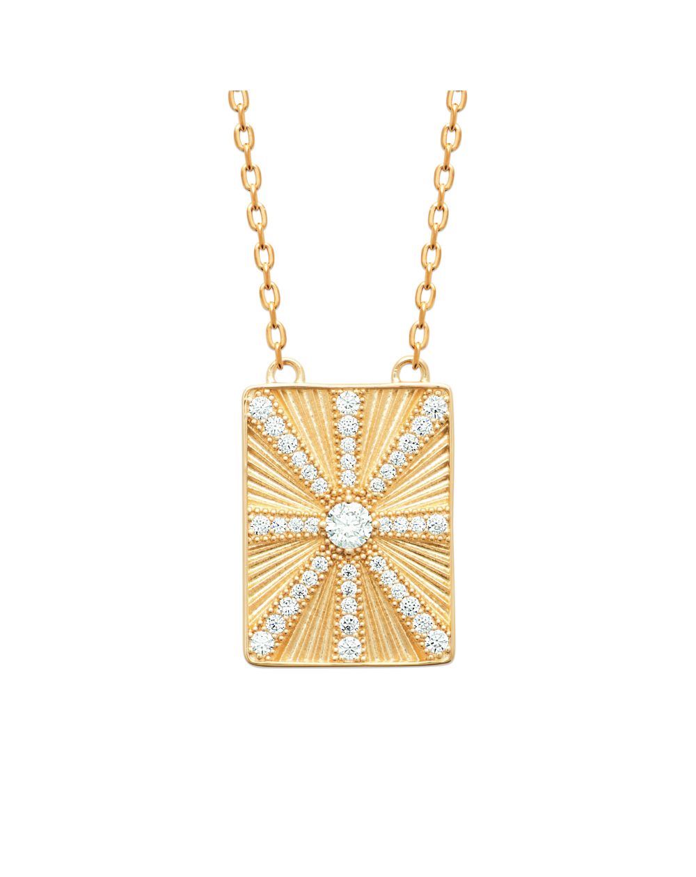 The Rayon d'Or necklace captivates with its finely crafted rectangular pendant, adorned with engraved rays that converge towards a central cubic zirconia, a symbol of light and brilliance. The cubic zirconias, delicately set along the radiating lines, capture the light intensely, offering an elegant and sophisticated sparkle.