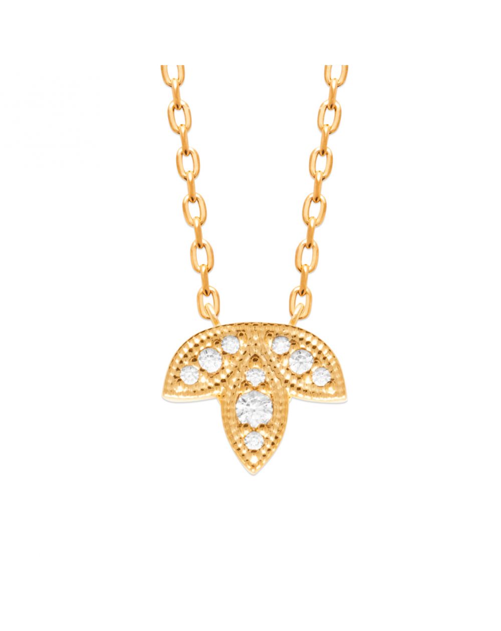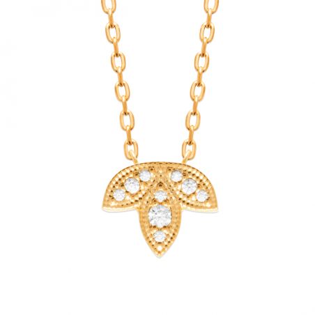 This affordable 18-karat gold-plated necklace is a delicate and luminous piece of jewelry, designed to add a touch of refined elegance to any silhouette. Its finely crafted pendant, enhanced by sparkling white stones , subtly captures the light and elegantly accentuates the décolletage.