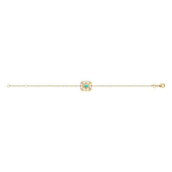 At the center, a delicate ornamental motif highlights a luminous turquoise stone, surrounded by colored stones that bring a vibrant and refined touch.