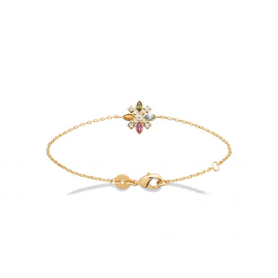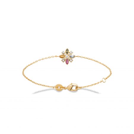 Be captivated by the charm of the Stella Multicolore gold-plated bracelet , a delicate and luminous piece that adds a subtle touch of color to your wrist. Its central floral star motif , adorned with delicately tinted stones, catches the light and elegantly draws the eye.