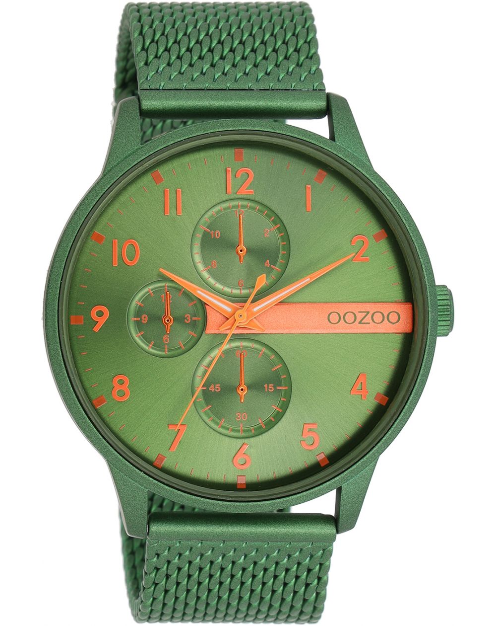 Stand out from the crowd with this stunning round design for men from the trendy OOZOO Timepieces collection. The C11303 features a matte green metal mesh bracelet and a 45mm matte green watch case. You make a real fashion statement with this green bar dial, neon orange numerals and silver/white hands. This must-have watch for your wardrobe features a mineral glass and a metal case with plating. This design has a stainless steel back plate and is nickel safe. This watch has a 2ATM Japanese movement and is backed by a 2-year warranty