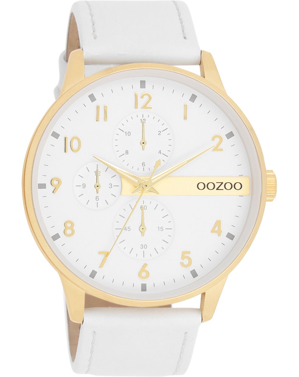 Stand out with this beautiful round design for men from the trendy OOZOO Timepieces collection. The C11305 features a white stitched leather strap and a 45mm gold-tone metal watch case. You make a fashion statement with this white bar dial, gold numerals and gold/white hands. This wardrobe essential watch features mineral glass and a metal case with plating. This design has a stainless steel backplate and is nickel safe. This watch has a Japanese 2ATM movement and is covered by a 2 year warranty.