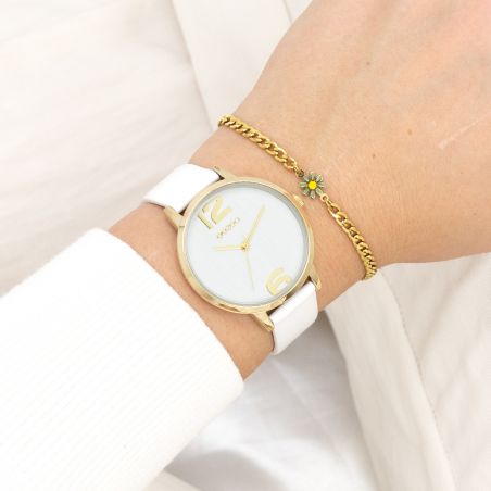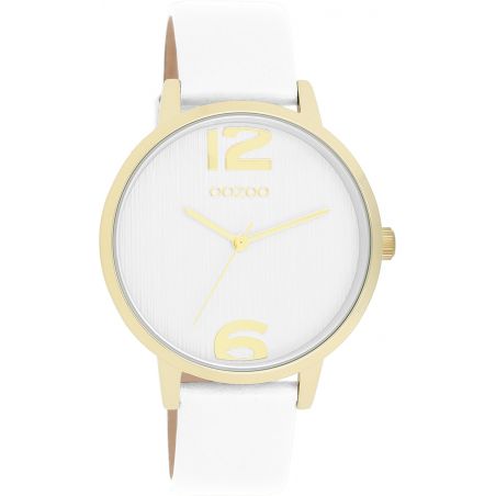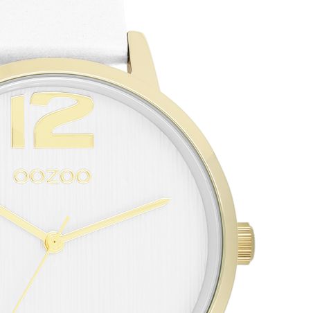 Stand out with this stunning round design for ladies from the trendy OOZOO Timepieces watch collection. Model C11340 features a white leather strap and a 38mm gold-colored metal watch case. Assert your style with elegance thanks to this white lined dial, its golden numerals and its matching hands. This essential watch for your wardrobe is equipped with a mineral glass and a metal case with IP plating, ensuring rugged durability. Its stainless steel back not only guarantees protection against nickel, but also absolute comfort. Powered by a Japanese 2ATM movement, it offers you reliable precision for all your adventures. Plus, get complete peace of mind with a 2-year warranty.