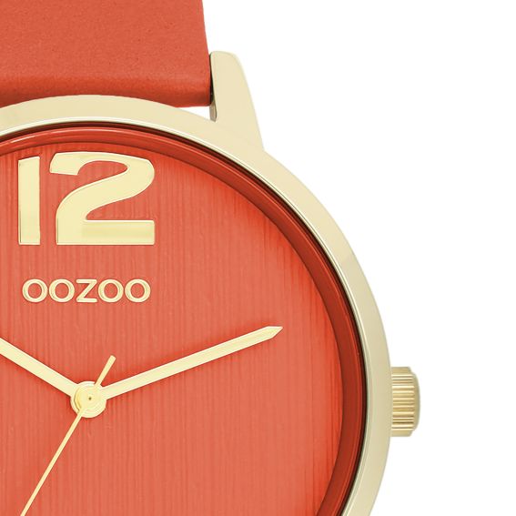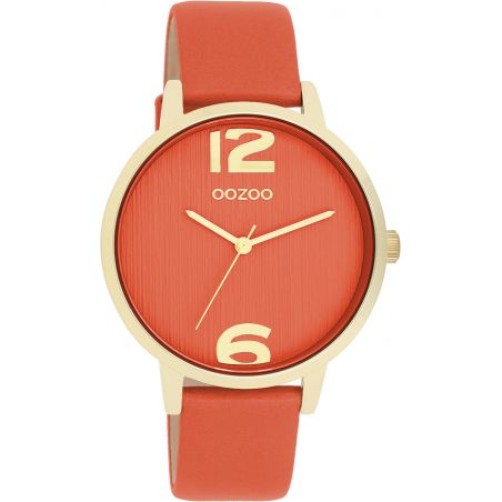 Stand out with this beautiful round design for ladies from the trendy OOZOO Timepieces watch collection. Model C11341 features a warm orange leather strap and a 38mm gold-colored metal watch case. Assert your style with confidence thanks to this warm orange lined dial, its golden numerals and matching hands. This essential watch for your wardrobe is equipped with a mineral glass and a metal case with IP plating, ensuring rugged durability. Its stainless steel back not only ensures protection against nickel, but also absolute comfort. Powered by a Japanese 2ATM movement, it offers you reliable precision for all your adventures. Plus, get complete peace of mind with a 2-year warranty.