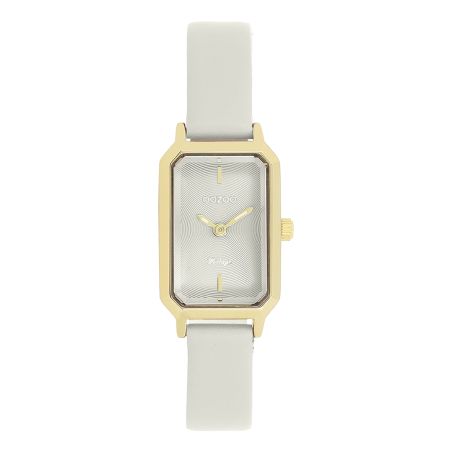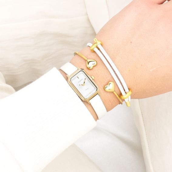Elegant and timeless, this women's watch impresses with its rectangular gold case with refined lines and its light beige leather strap , soft and comfortable on the wrist.