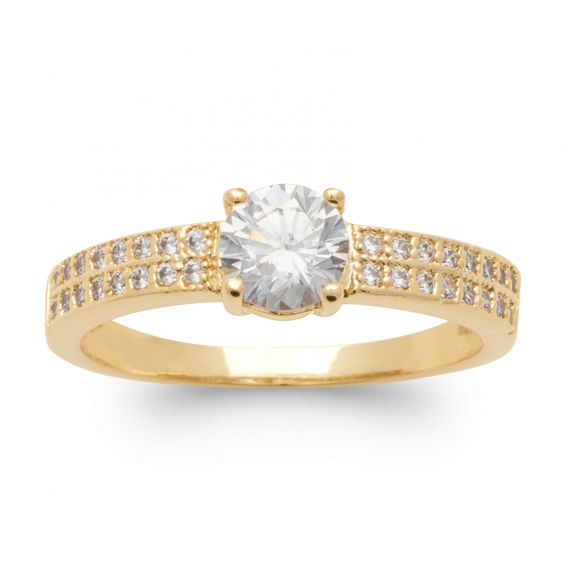 Discover the 18K gold-plated Solitaire Eternity ring, a timeless piece enhanced by a sparkling round cubic zirconia, highlighted by a double row of small pavé-set zircons on the band. Its luxurious brilliance and refined design make it an essential piece of jewelry for those who wish to combine elegance and modernity.