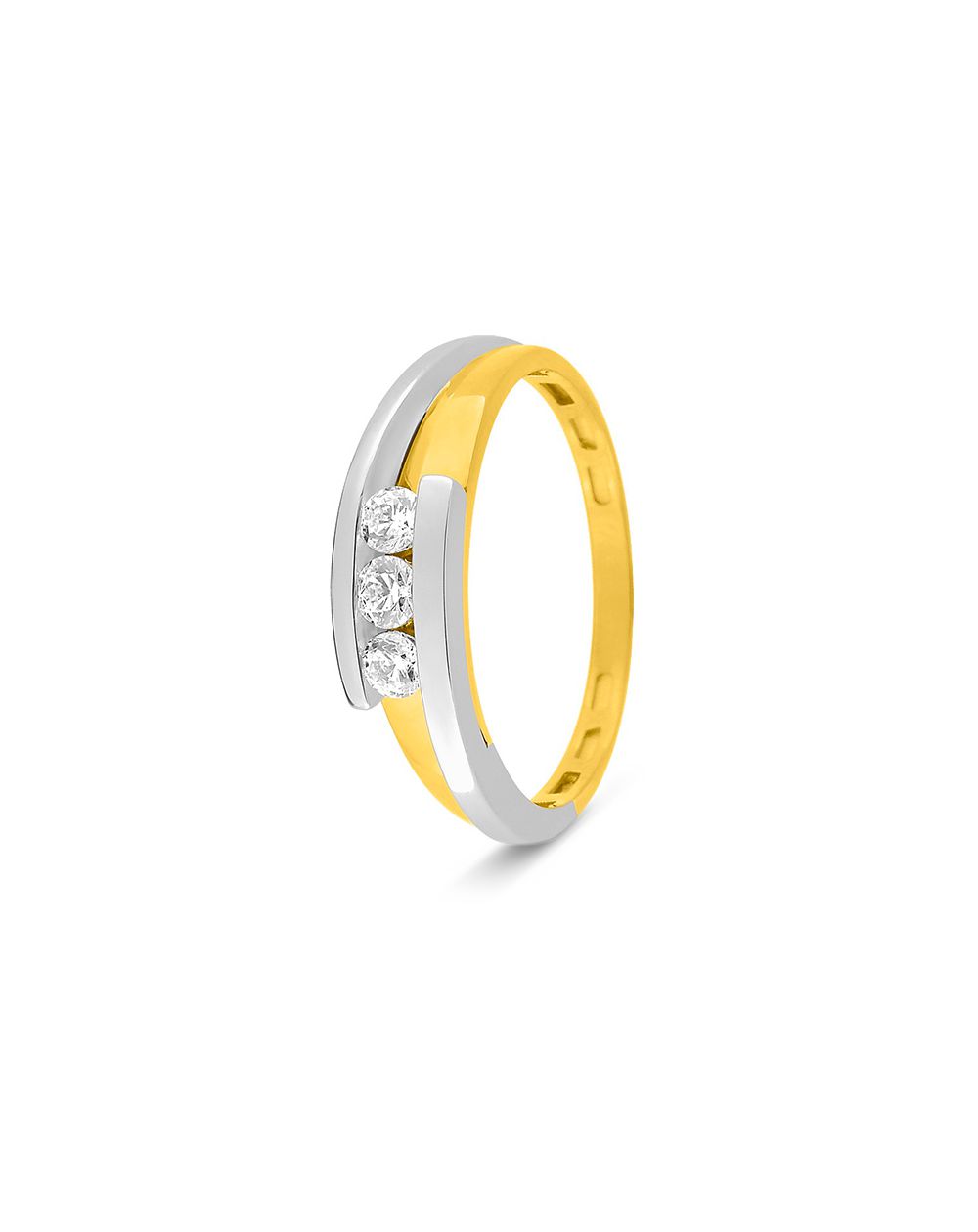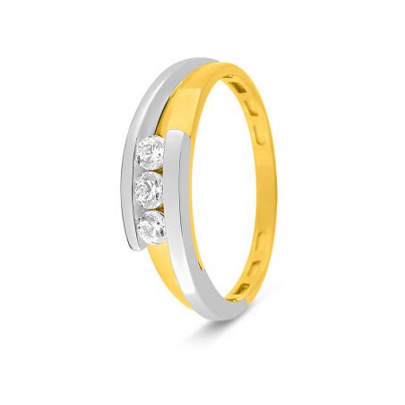This 9 carat two-tone gold ring is a ring with 3 cubic zirconia stones.