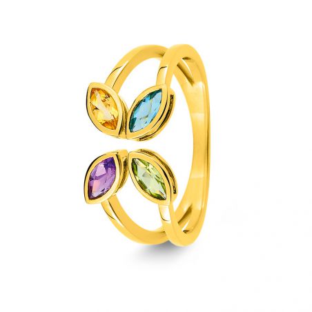 Amethyst, peridot, aquamarine and topaz flower ring in 9 carat yellow gold