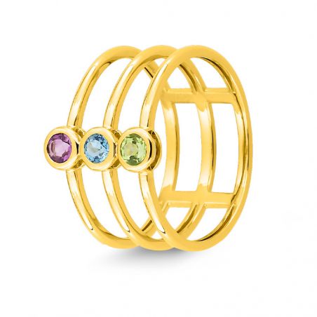 This 9 carat yellow gold ring is a triple row ring with 3 stones: topaz, amethyst and peridot. This can be engraved inside.