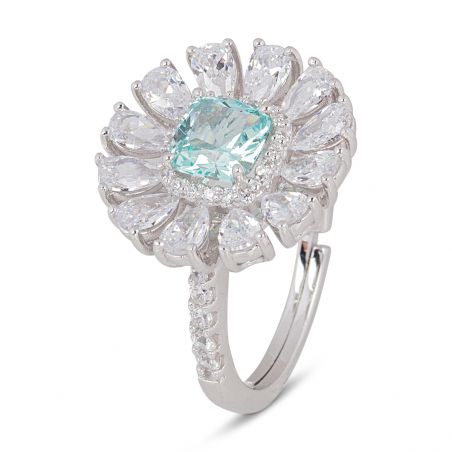This 925 silver ring is a large flower-shaped ring set with zirconium oxide stones.
