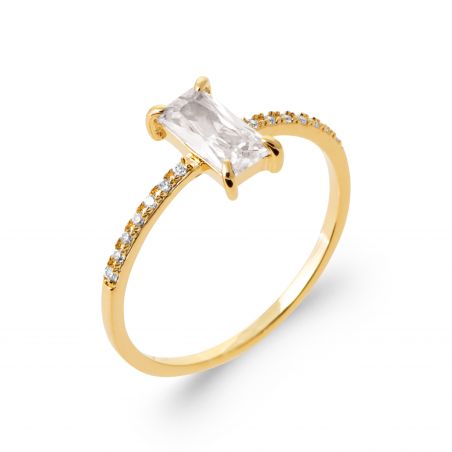 This high quality 18k gold plated ring is a fine solitaire set with a rectangular stone measuring 8mm long by 4mm wide. The body of the ring (measuring 2mm) is also set with zirconium oxide stones.