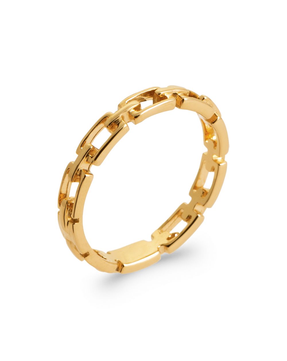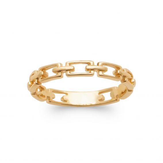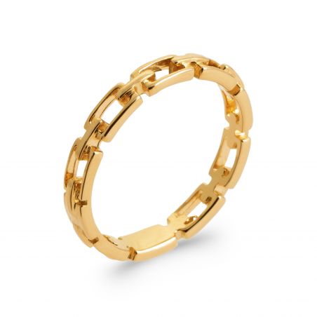 This gold-plated ring features a distinctive design with a hinged chain motif. Each link is finely crafted to resemble chain elements, creating a sense of continuity and fluidity around the ring. The design is both modern and industrial, giving this ring a bold character and a touch of originality. Its glossy finish adds an attractive shine, making it ideal for those looking for a piece of jewelry that is both elegant and casual.