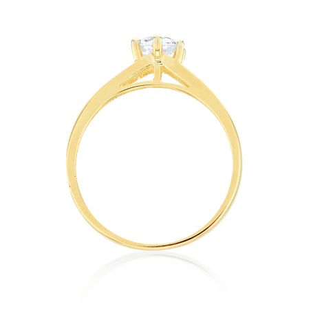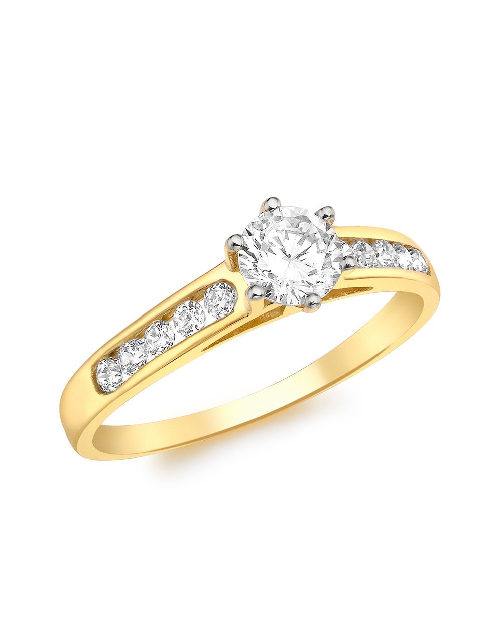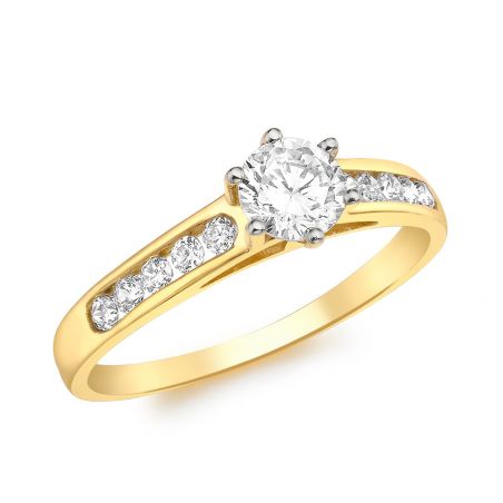 Enhance your proposal with this classic and timeless solitaire engagement ring . Crafted in 9k yellow gold , it features a 5mm round cubic zirconia center stone, captured in an elegant prong setting. This refined design is enhanced by ten 2mm stones perfectly aligned on the body of the ring, offering exceptional sparkle from every angle.