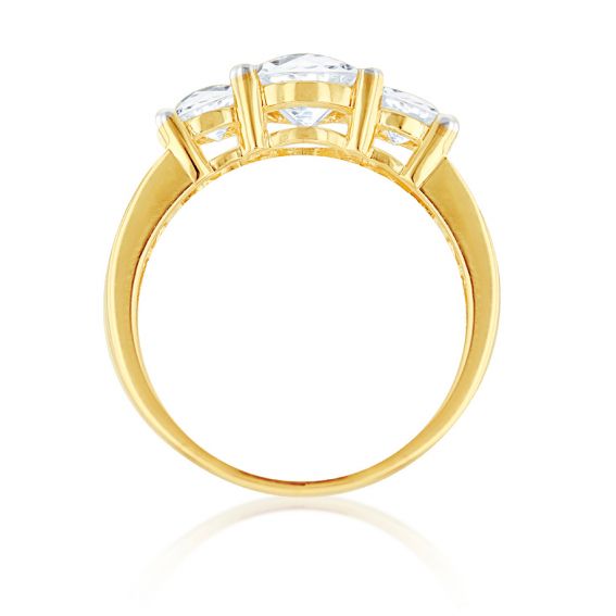 Offer a dazzling symbol of love with this inexpensive yellow gold solitaire ring , combining refinement and accessibility. Crafted in 9-carat yellow gold , it features a harmonious composition of three central zirconium oxide stones: a 6 mm round main stone framed by two 4 mm stones. This sparkling trio is enhanced by a lateral paving of six 2 mm zirconium oxides, delicately channel-set.
