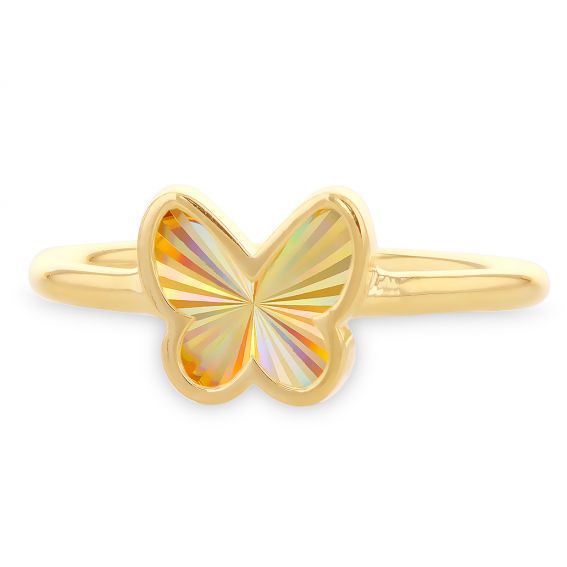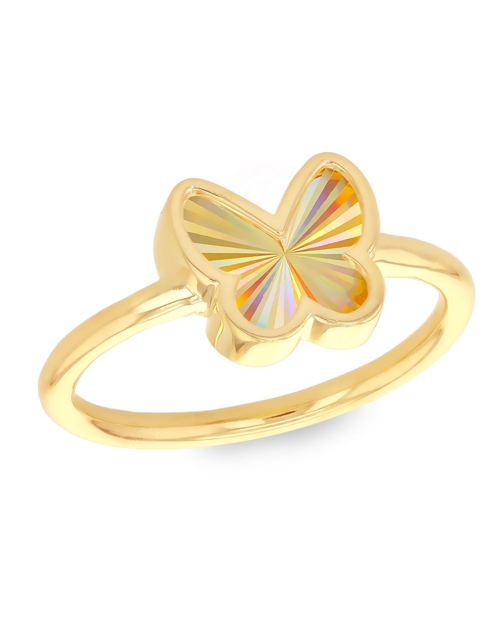 Let yourself be seduced by the poetry of this 9-carat yellow gold butterfly ring , with its modern and enchanting design. Its butterfly-shaped motif with rainbow reflections captures the light with brilliance thanks to its fan-cut finish, evoking lightness and metamorphosis.