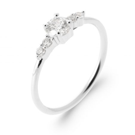 Its refined design showcases a luminous central stone , enhanced by delicate zirconium oxides arranged on either side. This interplay of brilliance provides a subtle sparkle while maintaining a refined elegance.