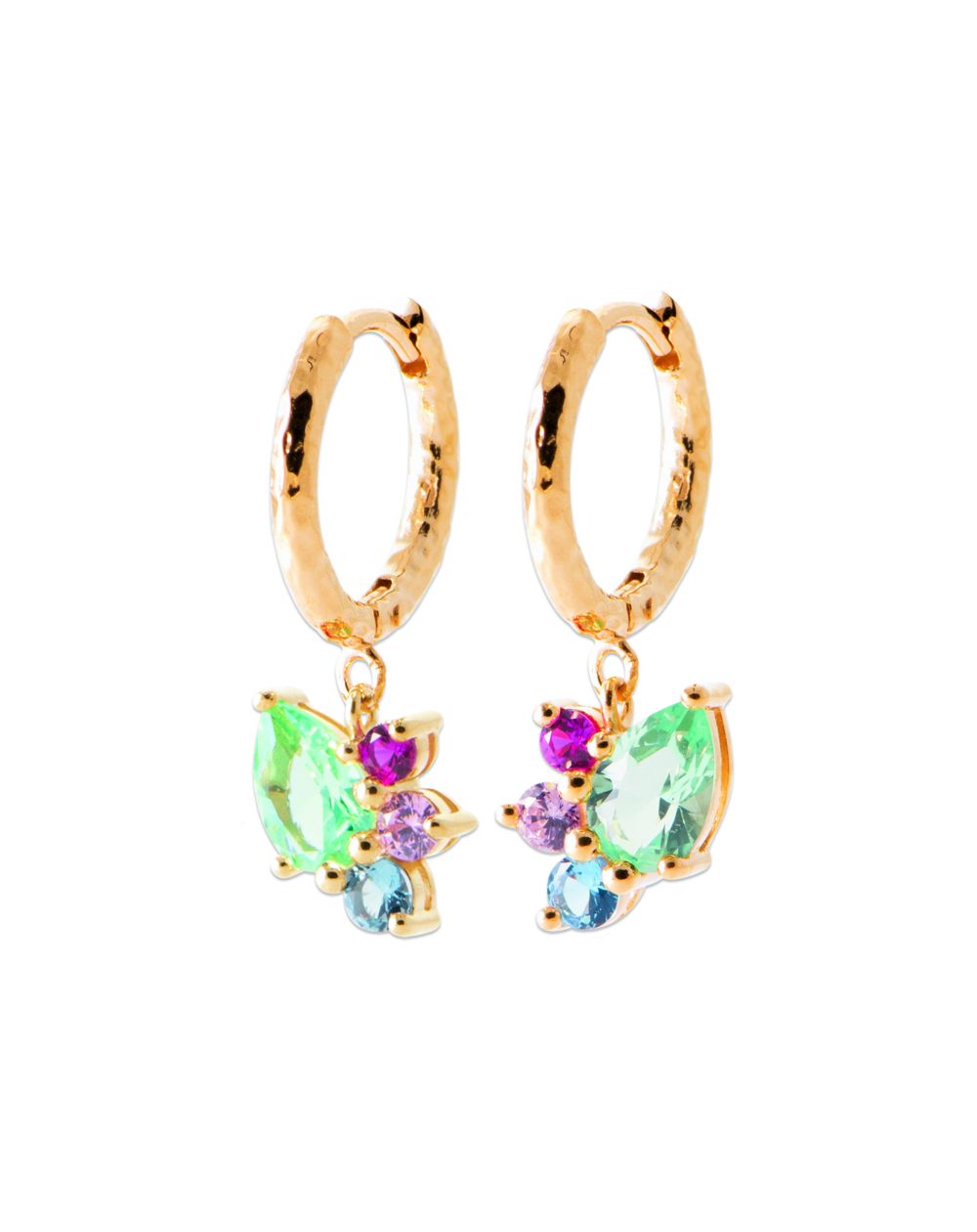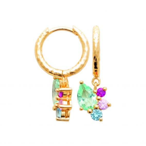 These 18-carat gold-plated earrings are jeweled hoop earrings with colored stones.