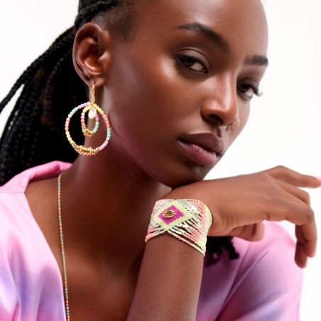 An essential and timeless element, our iconic cuff continues to reinvent itself! Here it displays the soft, luminous hues of the summer skies, just before the sun hits the horizon. We love its XL format and the delicate weaving of the seed beads which sumptuously adorn the wrist. In the center, our fine gold cowrie shell, timeless and iconic, adds a touch of glamor and chic to this cuff.