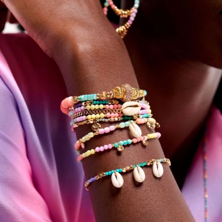 If we could capture the essence of summer in a piece of jewelry, this tangy-hued double-row bracelet would be the perfect embodiment. It evokes the sweetness of holidays, the murmur of the waves, the sea shores, the sea spray, the sand slipping through the fingers, and the bright summer skies. Pretty fine gold-plated bells adorn the two rows of the bracelet, while a cowrie shell, an emblematic piece of our theme, completes its structure. A summer and timeless must-have, with sweet childish notes, that you won't want to take off!