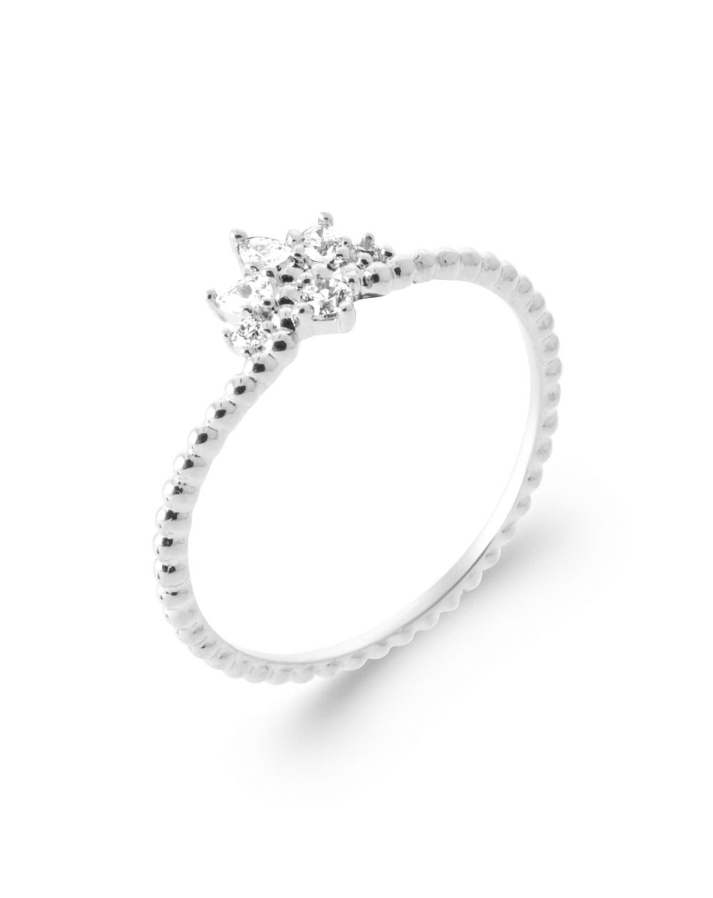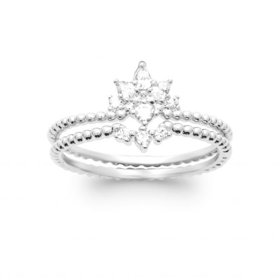 The Iséline ring captivates with its delicate double-band design, enhanced by a central motif of sparkling stones in a cluster .