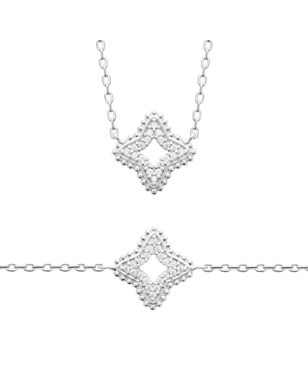 Its geometric star -shaped pendant, delicately set with sparkling zirconias, offers a subtle and refined sparkle.