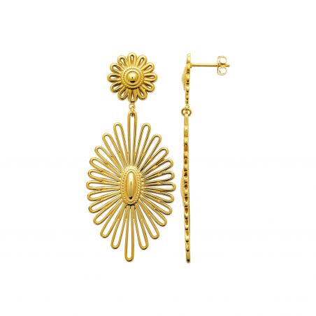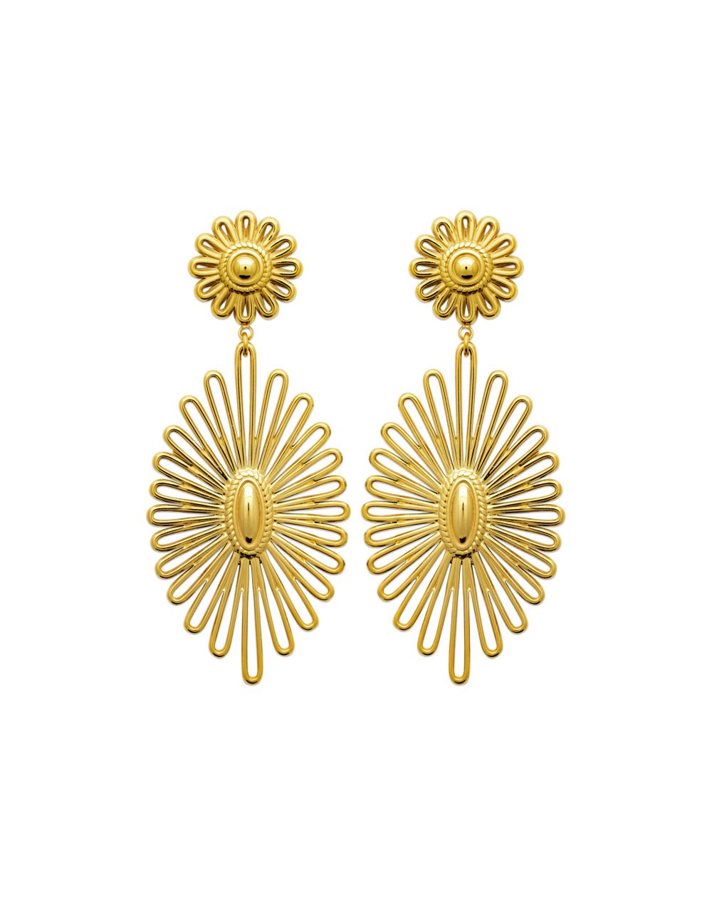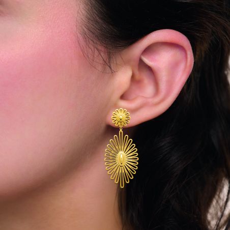 The contrast between the delicate flower at the top and the wide radiant pattern below creates an elegant and dynamic silhouette, ideal for enhancing the face and catching the light with every movement.