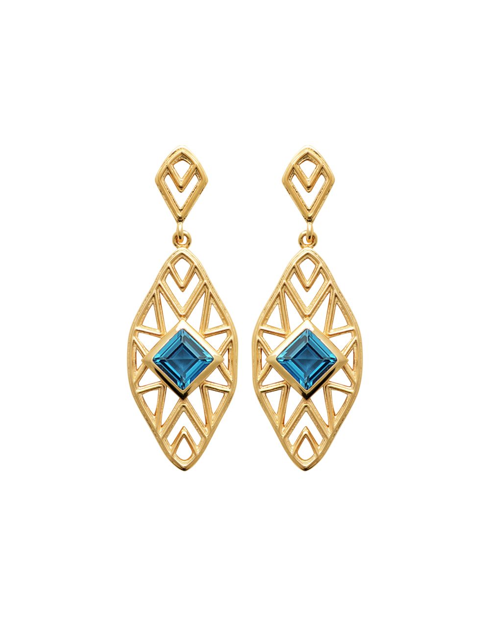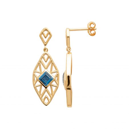 Elevate your look with the Eloria earrings , a creation with a refined and graphic design. Made of 18-karat gold plating , they are distinguished by their openwork structure with geometric patterns , highlighting a luminous and captivating square blue stone at the center.