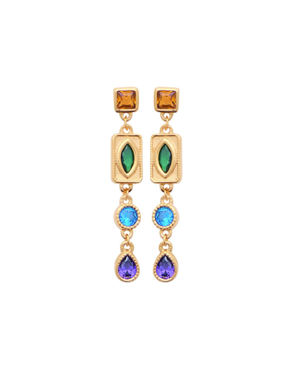 Each element adds character: a square golden stone , a green marquise stone , a round blue stone , and a purple drop , creating a subtle and original harmony. Their asymmetrical and structured design is eye-catching while remaining chic and sophisticated.
