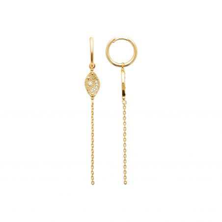 Let yourself be seduced by the finesse of the Nerina earrings , a delicate and dynamic creation. Made of 18-carat gold plating , they combine a thin and elegant ring with a textured central motif set with cubic zirconia , extended by a fluid and light chain .