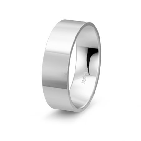 Cette alliance en or blanc 18 carats est une alliance ruban de surface plate. Cette alliance mesure 6mm de large et peut-être personnalisée d'une gravure (date et prénoms).