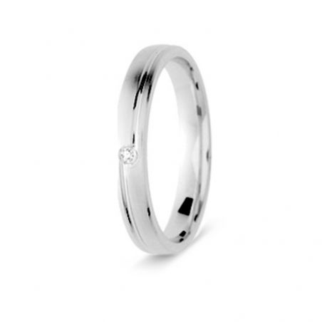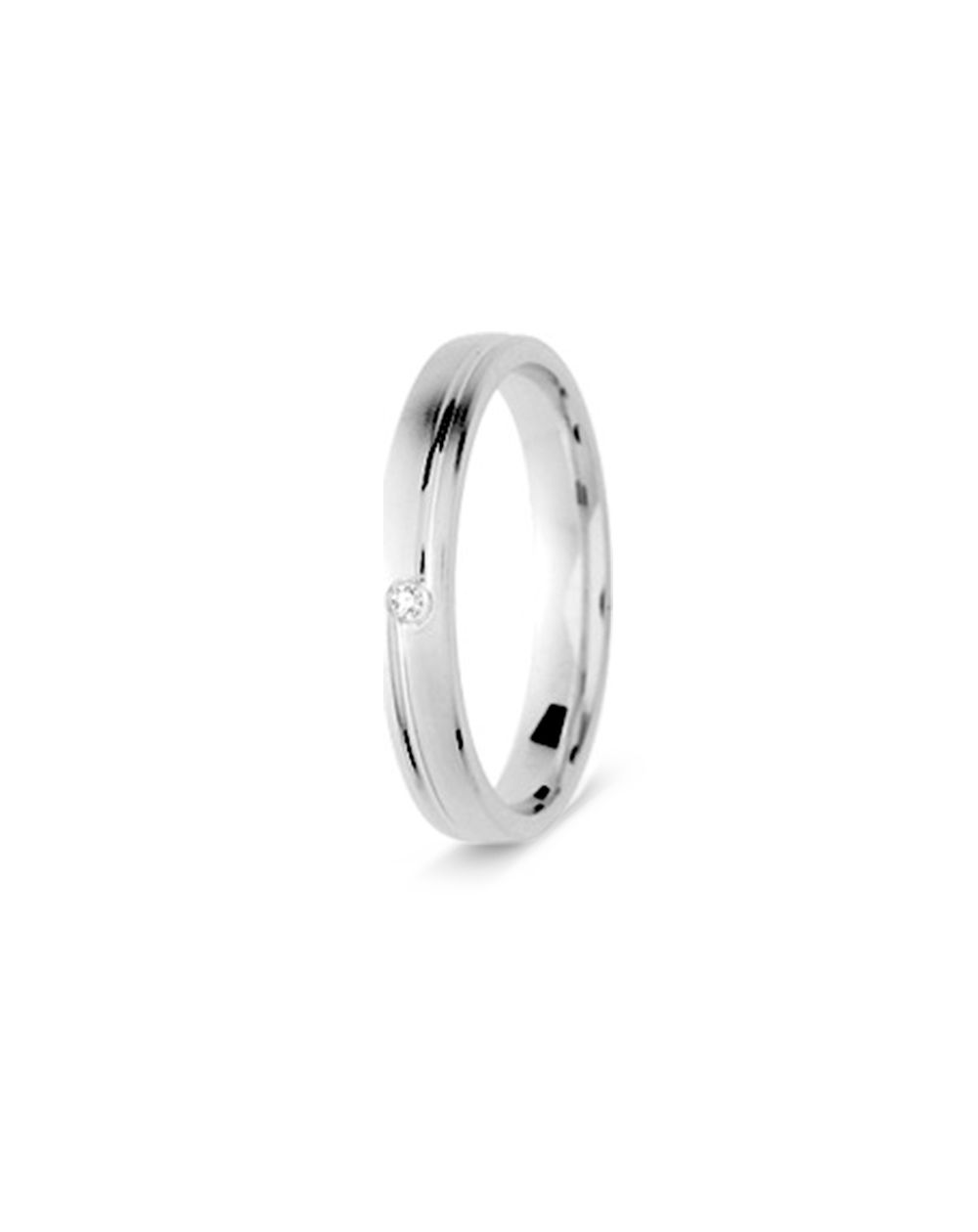 Cette alliance en or blanc 18 carats est une alliance sertie d'un unique diamants de 0,01 carat. Cette alliance peut-être personnalisée d'une gravure (date et prénoms).