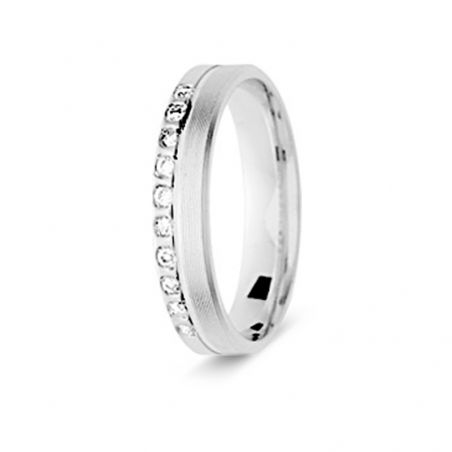 Cette alliance en or blanc 18 carats est une alliance sertie de 10 diamants de 0,01 carats. Cette alliance peut-être personnalisée d'une gravure (date et prénoms).