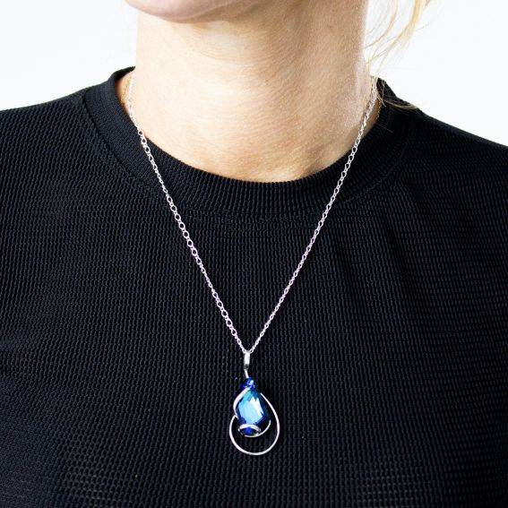 Le pendentif est orné d'un magnifique cristal Swarovski bleu azur, apportant une touche de brillance et de couleur à votre tenue. Sa longueur de 43cm est idéale pour mettre en valeur votre cou et son pendentif de 42mm de haut sur 20mm de large