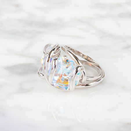 Les pierres AB multi reflets, sont des cristaux Swarovski mesurant 14mm de côté. Cette bague sur monture argent est ajustable et s'adapte à la taille de votre doigt.