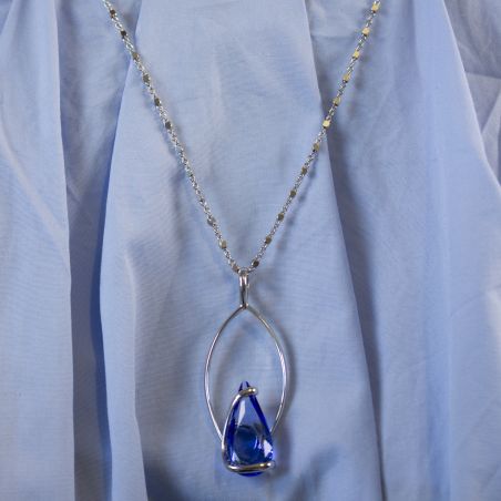 Ce cristal bleu profond, d'une hauteur de 5 cm, capte magnifiquement la lumière, créant un effet spectaculaire et vibrant. La monture argentée qui entoure le cristal ajoute une touche moderne et sophistiquée au design. Ce collier est une pièce remarquable, idéale pour rehausser une tenue avec une note de glamour et d'élégance, tout en incarnant le style distinctif et l'artisanat raffiné d'Andrea Marazzini.