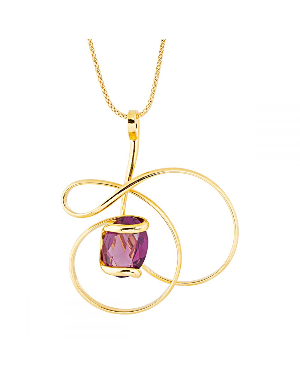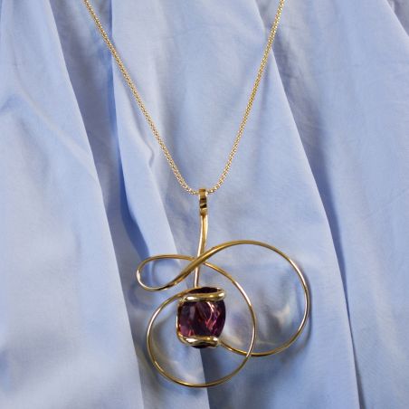 Le cristal, d'une teinte violette profonde et envoûtante, est délicatement enveloppé dans une monture dorée aux courbes gracieuses qui forment un motif floral stylisé, rappelant une orchidée.