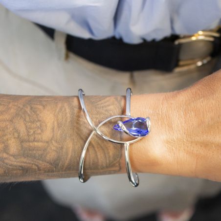 Le design du bracelet se distingue par sa structure en forme de double arche, qui encadre délicatement le cristal central. Cette disposition crée un équilibre parfait entre la simplicité de la forme et la richesse de la couleur du cristal, rendant le bracelet à la fois discret et captivant.