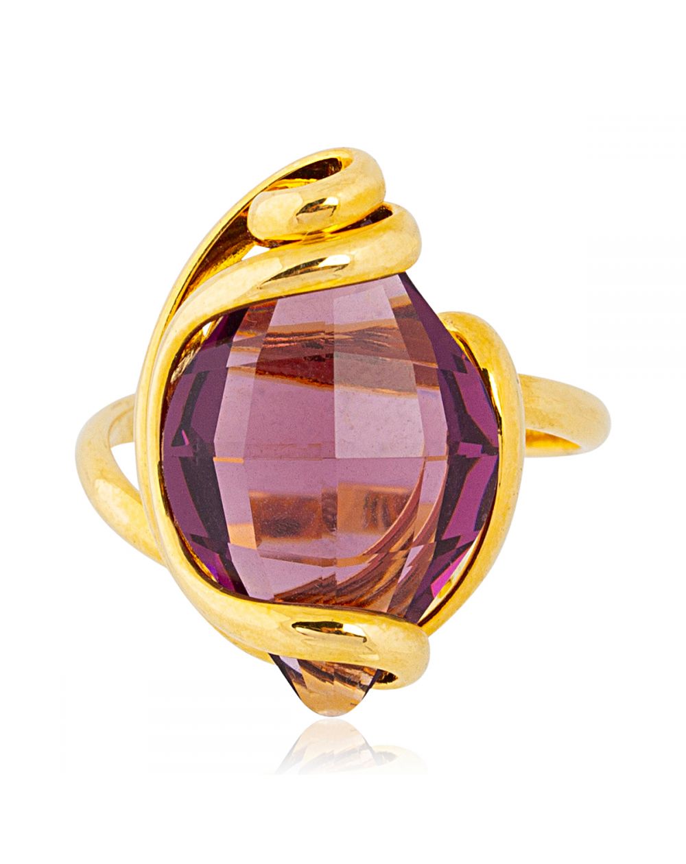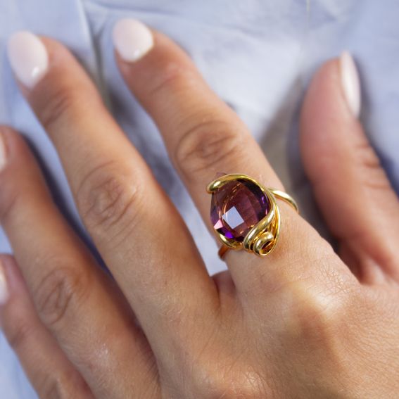 La pierre centrale, avec ses nuances riches et vibrantes de violet et de rose, est subtilement entourée par une monture dorée qui épouse parfaitement ses courbes, créant un effet visuel harmonieux et captivant.