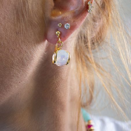 La monture dorée enserre délicatement le cristal, offrant un contraste élégant qui accentue l'éclat subtil de la White Opale. Ces boucles d'oreilles sont le choix parfait pour celles qui cherchent à ajouter une touche de sophistication discrète à leur look quotidien ou pour rehausser une tenue de soirée.