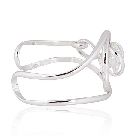 La monture de ce bracelet est en métal argenté avec un design épuré et contemporain. Les lignes fluides et entrelacées du métal créent une forme ouverte et organique qui encadre le cristal central, ajoutant une touche d'élégance moderne. Le cristal Swarovski présente un éclat irisé, avec des reflets lumineux et multicolores, capturant la lumière sous différents angles.