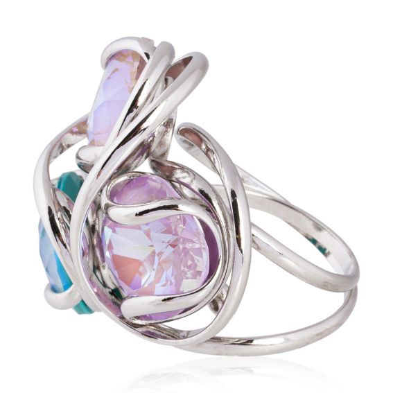 Le design de la bague est audacieux et artistique, avec les cristaux agencés dans une forme volumineuse et organique qui capte la lumière sous tous les angles. Chaque cristal Swarovski, taillé avec précision, scintille de reflets iridescents, ajoutant une touche de magie à l’ensemble. La monture argentée vient souligner ces pierres précieuses tout en offrant un contraste subtil qui met en valeur les couleurs vibrantes des cristaux.