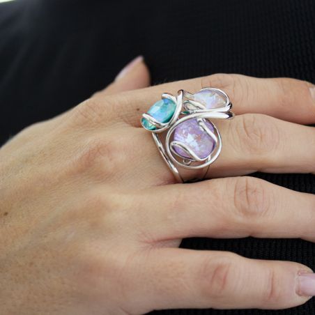 Cette bague est idéale pour celles qui recherchent une pièce à la fois unique et audacieuse, parfaite pour ajouter une note éclatante à une tenue élégante. Le design complexe et la richesse des couleurs en font une bague exceptionnelle, à la fois moderne et intemporelle.