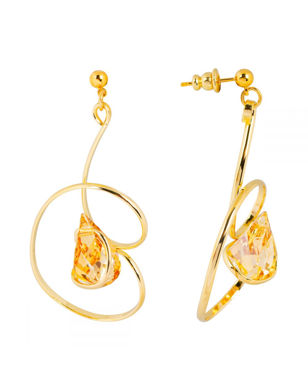 Leur design en métal doré met en valeur un somptueux cristal Swarovski Golden Shadow, taillé en goutte facettée. Ce cristal aux reflets chauds et ambrés capte magnifiquement la lumière, révélant des nuances chatoyantes et élégantes. Sertie dans une structure torsadée qui semble l’enlacer avec légèreté, la pierre flotte au cœur du bijou, créant un effet de profondeur et de volume saisissant.
