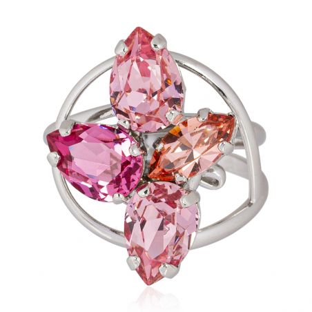 Inspirée par la nature, cette bague en métal argenté arbore un design délicat en forme de fleur, sertie de cristaux Swarovski aux nuances roses et orangées. Son éclat raffiné illumine chaque tenue, offrant une touche féminine et romantique. Un bijou sophistiqué, idéal pour une allure élégante et lumineuse.