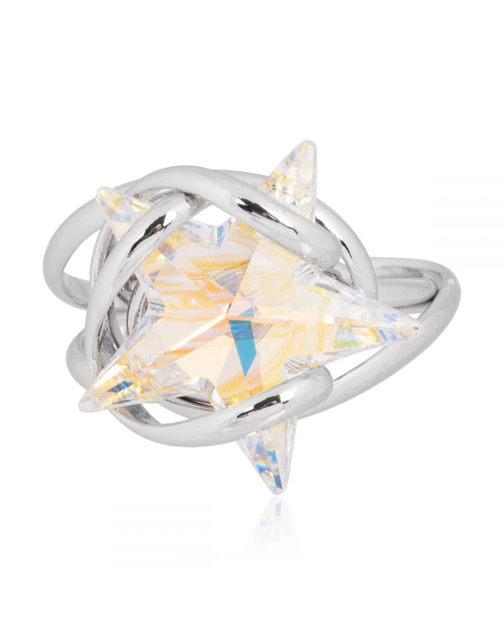 Brillez de mille feux avec cette bague Marazzini, une création exclusive d’Andrea Marazzini. Son somptueux cristal Swarovski en forme d’étoile capte la lumière avec une intensité saisissante, révélant des reflets changeants aux nuances dorées et bleutées grâce à l’effet Aurora Borealis (AB).