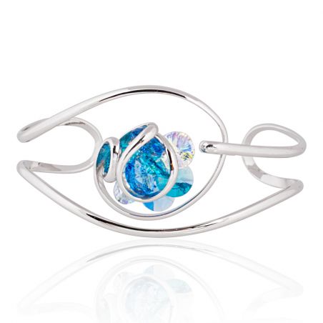 Entièrement fait main en Italie, il associe une structure fluide en laiton rhodié finition argentée à un bouquet de cristaux Swarovski aux nuances de bleu lagon, turquoise et bleu nuit, sublimés par des éclats irisés.