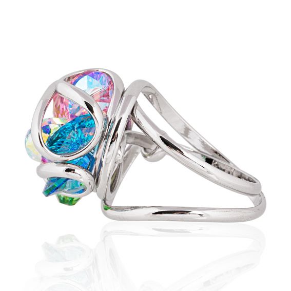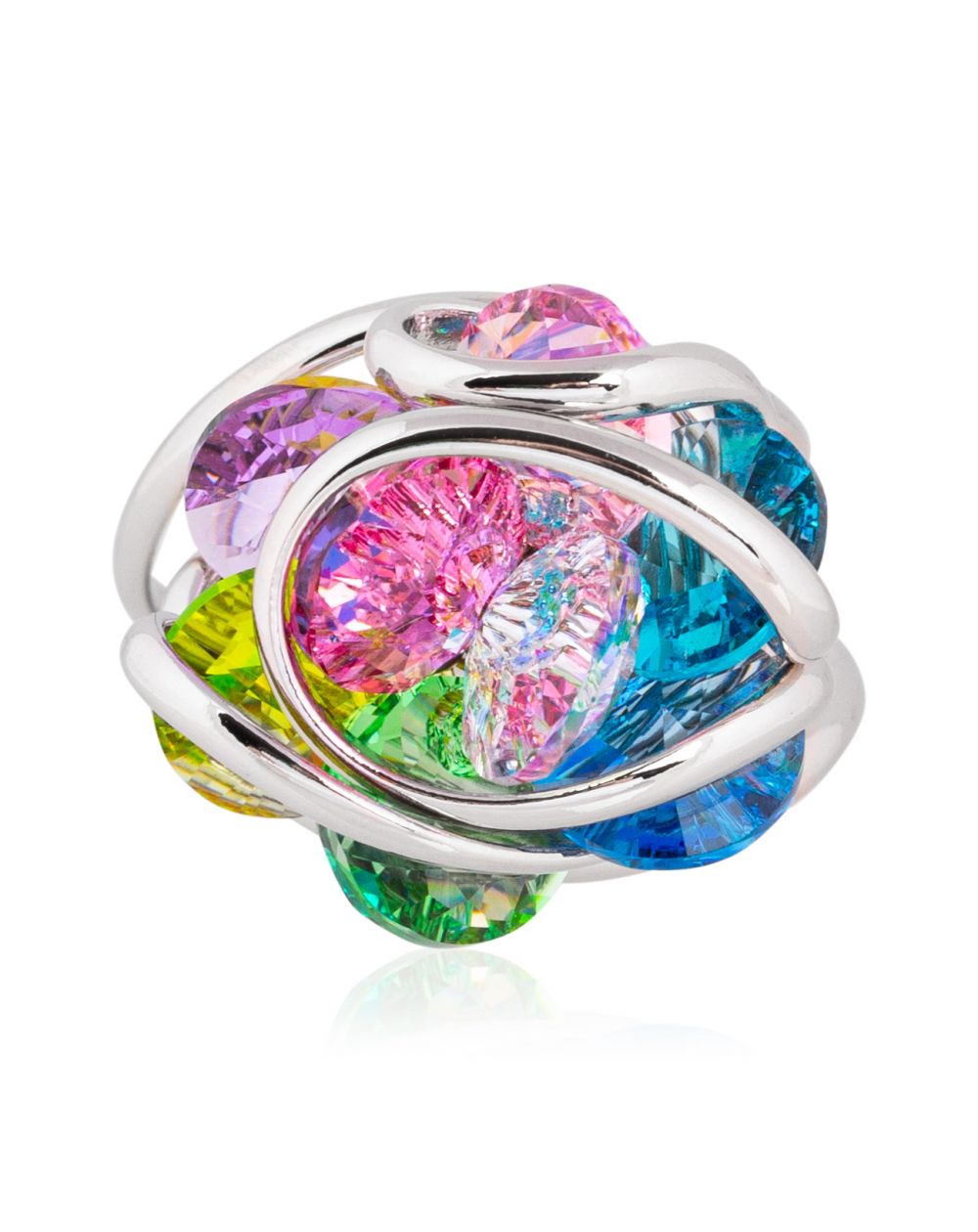 Audacieuse et vibrante, la bague Ninfea F43 Rio d’Andrea Marazzini est une pièce spectaculaire entièrement fabriquée à la main en Italie. Son design floral et artistique se compose d’un entrelacs argenté qui enlace un bouquet de cristaux Swarovski multicolores — rose, vert, bleu, violet, jaune — reflétant la lumière avec intensité.