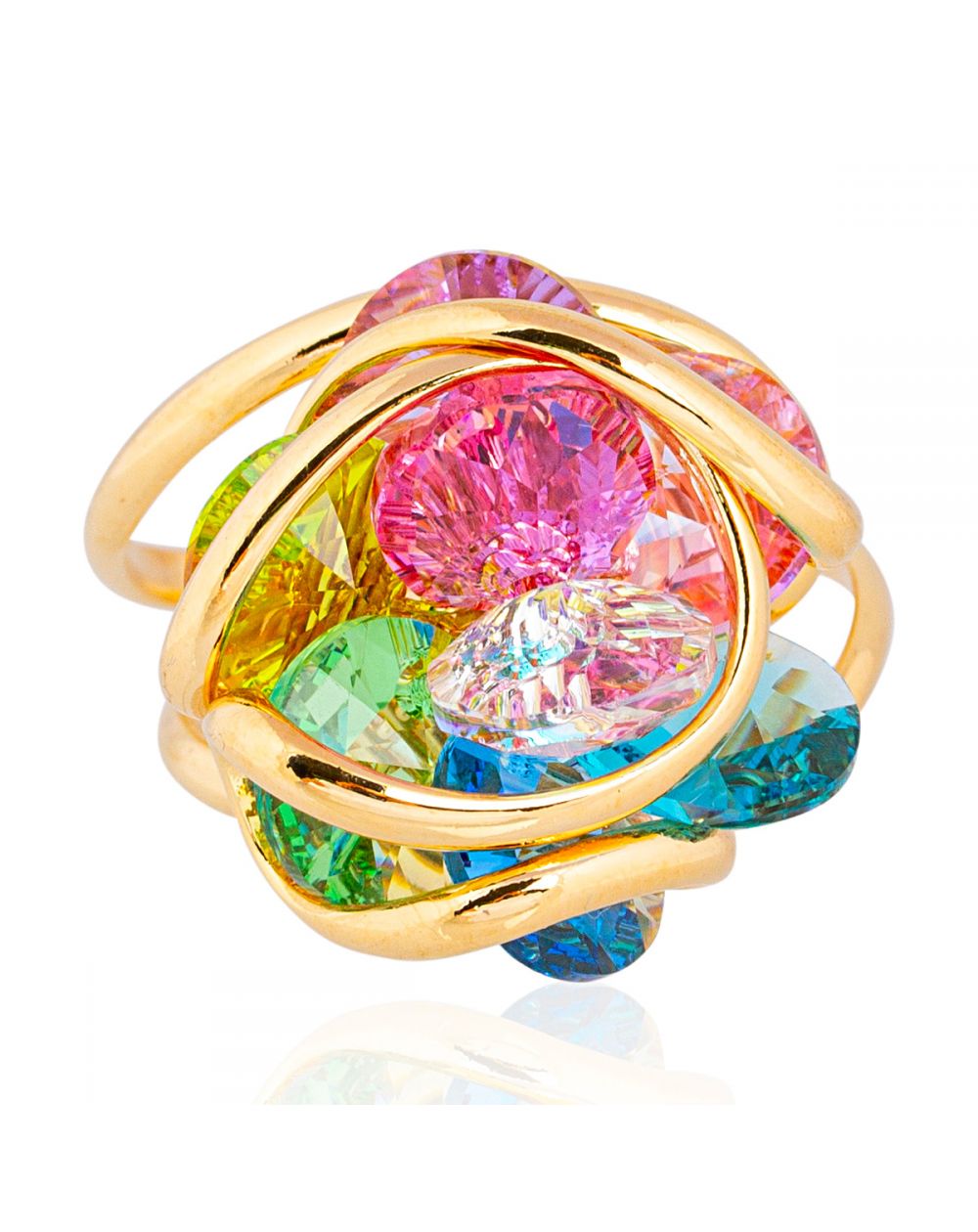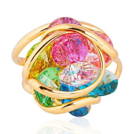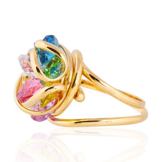 Spectaculaire et éclatante, la bague Ninfea F43 Rio d’Andrea Marazzini est une création artisanale italienne qui allie audace et raffinement. Sa monture en laiton doré à l’or fin enlace un bouquet chatoyant de cristaux Swarovski multicolores — rose, vert, turquoise, violet, jaune — reflétant la lumière avec intensité.