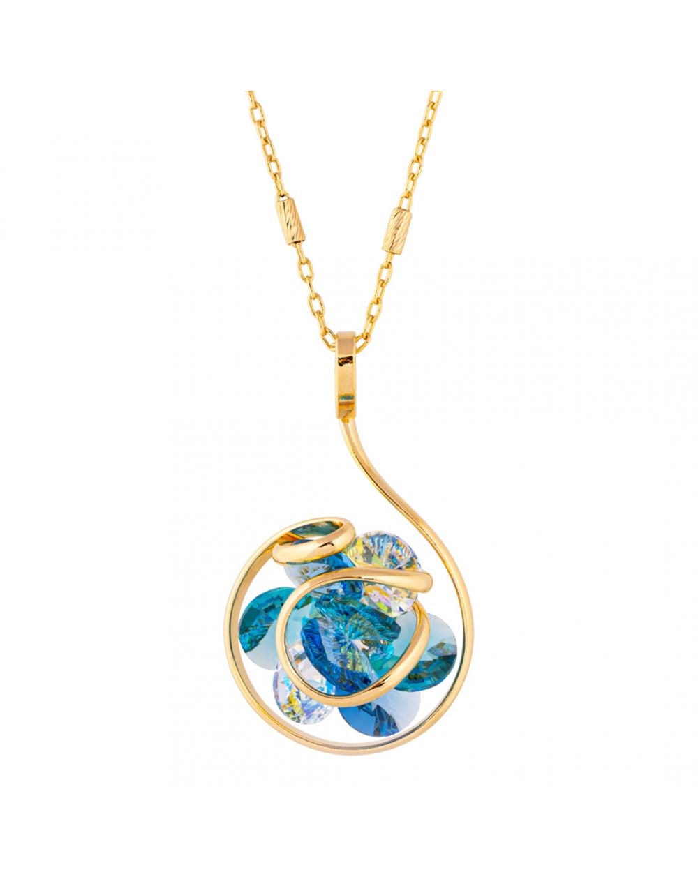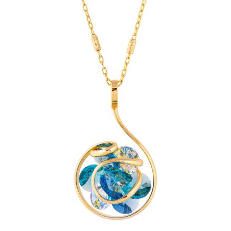 Un collier raffiné qui allie éclat et modernité. Le pendentif Ninfea F26 Mix Blue séduit par son bouquet de cristaux facettés aux nuances bleues et turquoise, délicatement enlacés dans une monture dorée aux lignes artistiques. Chaque reflet capte la lumière avec intensité, offrant une élégance unique et lumineuse.