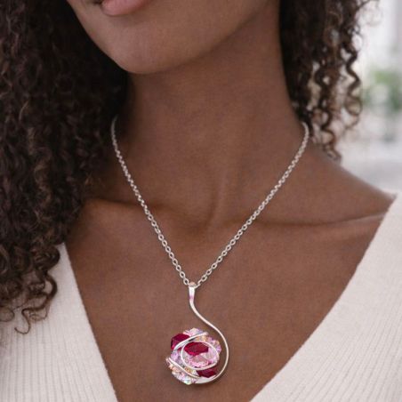Le cristal central, d’un diamètre de 34 mm, est mis en valeur par une structure argentée aux lignes fluides et élégantes. Le pendentif mesure 57 mm de hauteur, offrant une présence remarquable tout en restant harmonieuse sur le décolleté. La chaîne réglable de 45 à 48 cm permet d’adapter facilement le collier à différentes tenues et styles.
